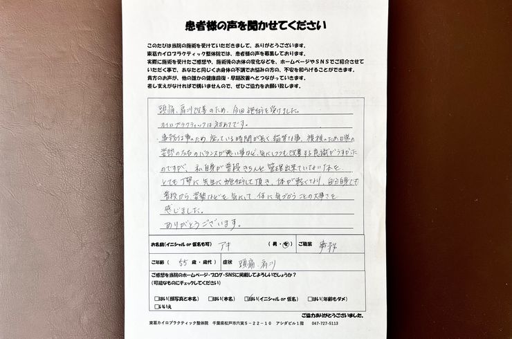 2026/01/23松戸の、松戸市のカイロプラクティック整体院、カイロプラクティック肩こりや頭痛を快方へと導く、松戸整体院「東葛カイロプラクティック整体院」の岡部です。 「頭痛、肩こり改善のため、今回施術を受けました。 カイロプラクティックは初めてです。 事務仕事のため、座っている時間が長く、猫背の事、複視のため日常の姿勢の左右のバランスが悪い事など、気にしつつも改善する意識がうすかったのですが、 私自身...