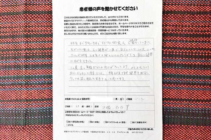 回数券を使い切る頃には、姿勢もまっすぐでよく眠れて健康的になられ、ずいぶんと足取りも軽やかでお喋りになられていました。